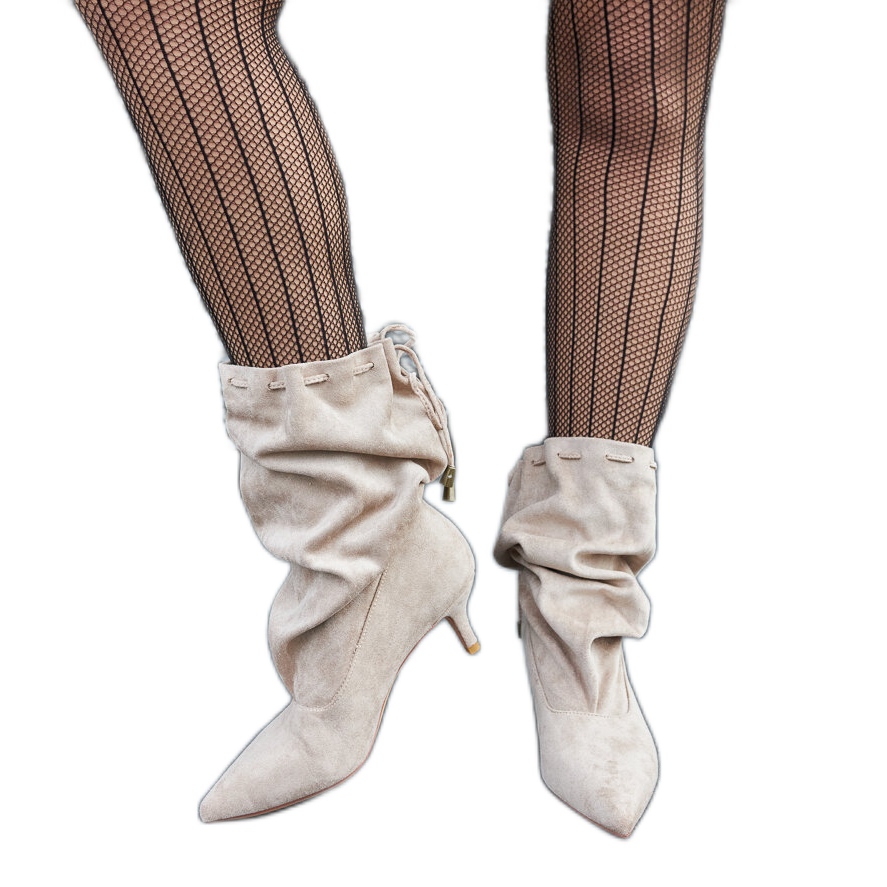 Botas elegantes e universais que atingem metade da panturrilha feita de Eco-Leste em um tom delicado e cremoso. O nariz de especiarias característico fornece a leveza da figura e as malditas femininas, e um corte moderno e baixo com um pino fino (5,5 cm) combina conforto com uma aparência elegante. O design fornece um corte deslizante suplementado com uma trava prática nas laterais, o que facilita a inserção e a remoção de sapatos. Ideal para a temporada de outono -in -świosna -elegante, confortável e ecologicamente correto, graças ao uso de couro ecológico de camurça.