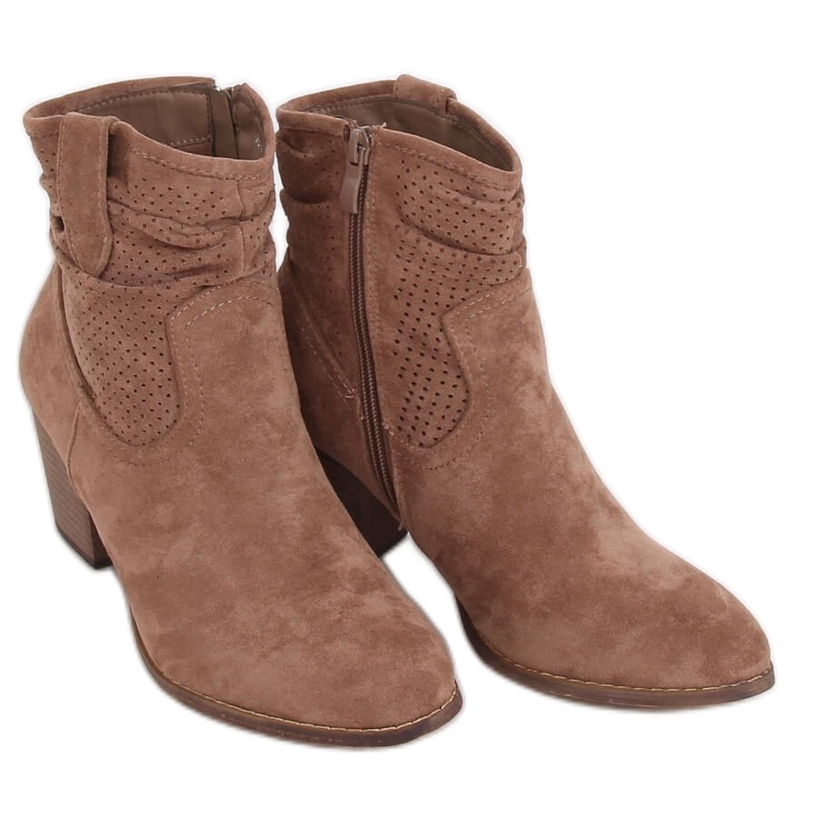 Descubra os exclusivos botins bege de salto alto 100-987B0-2 em tons de cáqui e castanho que complementam perfeitamente qualquer estilo do dia a dia! Estes botins femininos em camurça apresentam um salto estável de 6,5 cm, o que os torna confortáveis e elegantes.
