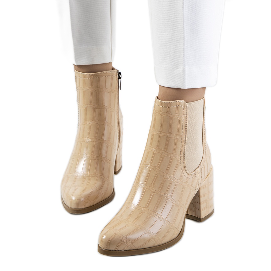 Botas de Easthaven clássicas em bege de couro ecológico. Um modelo com nariz sutil e pontiagudo, incorporado em um poste estável (7 cm), ligeiramente isolado do interior - a escolha perfeita para estilizações de outono e inverno. Um fixador de zíper por dentro garante confortável em colocar e a prensagem da pele do crocodilo que imita a pele adiciona um personagem elegante aos sapatos.