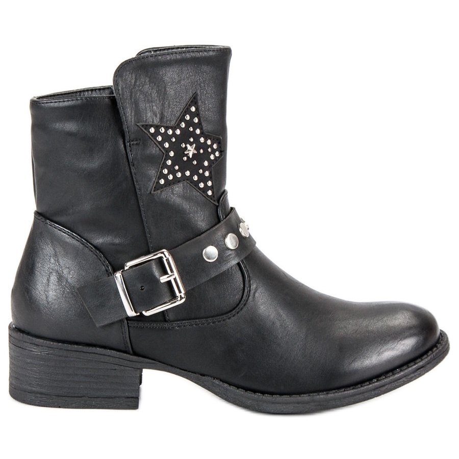 Descubra o seu lado rock com os nossos exclusivos botins pretos, que se tornarão um elemento insubstituível do seu guarda-roupa. O estilo destes sapatos chama a atenção - uma fivela decorativa elegante e uma estrela sutil feita de miçangas conferem-lhes um caráter único. Essas botas combinam perfeitamente com estilos rock, mas também combinam com roupas casuais do dia a dia.