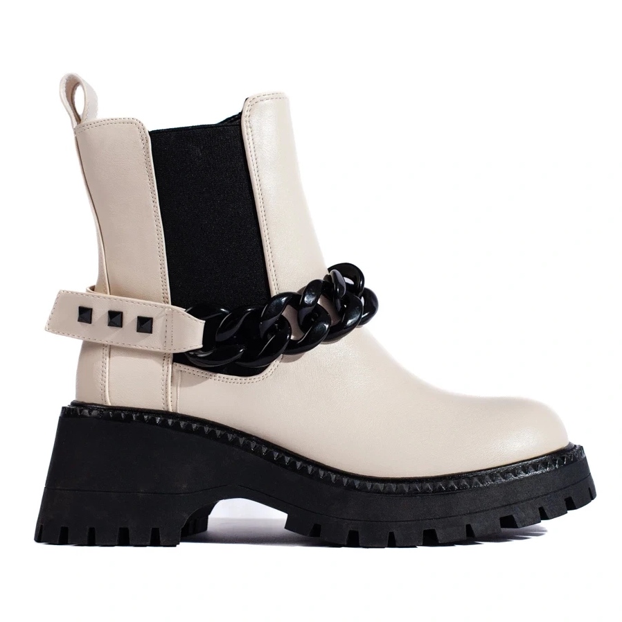 Chelsea Boots, elegante e universal, que combinam um estilo casual com soluções práticas para dias mais frios. Feito de couro ecológico em uma cor bege moderada com detalhes em preto e uma corrente decorativa, ideal para estilizações de outono-inverno.