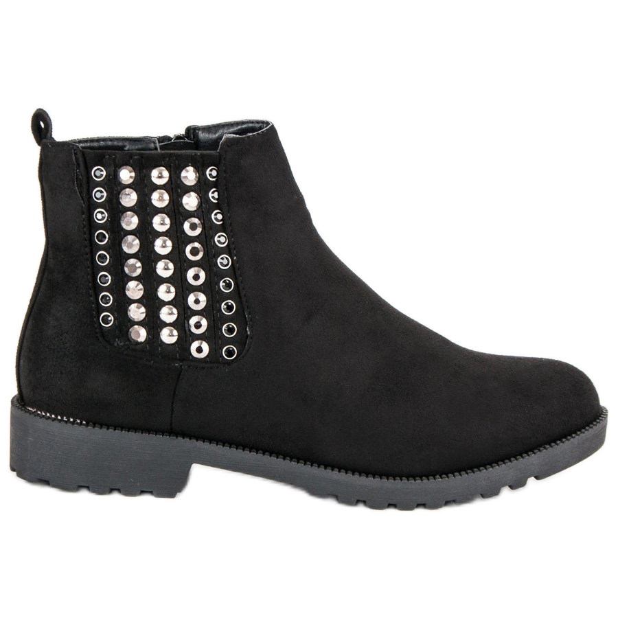 A cor preta e o formato sutil e redondo da biqueira os tornam chiques, e o delicado salto plano de 3,0 cm enfatiza o formato feminino do calçado, garantindo conforto no uso diário. Nas laterais das botas Chelsea há fileiras de strass brilhantes, que lhes conferem personalidade e chamam a atenção.