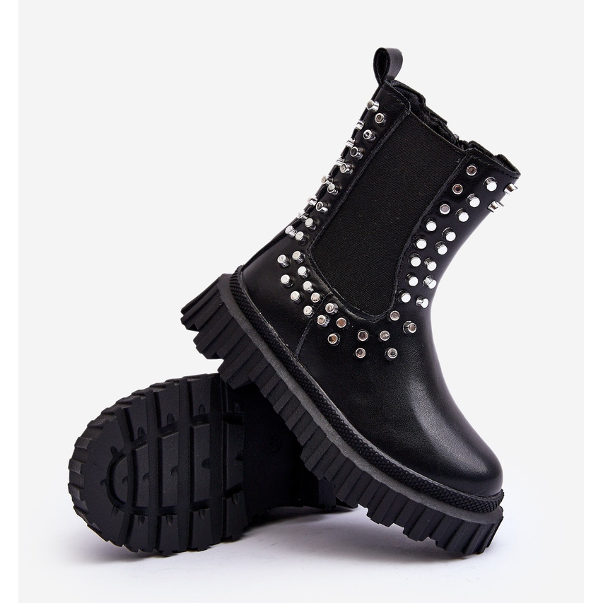 Botas Jodhpur das meninas Adelie - estilo, conforto e calor nos dias mais frios. Feito de couro ecológico de alta qualidade, situado em uma plataforma de 3 cm e saltos planos, decorados com strass brilhantes que adicionam charme feminino. O interior isolado com pêlo macio oferece conforto e calor, e o calcanhar rígido estabiliza o pé. Graças à trava lateral, colocar e decolar é rápido e confortável - perfeito todos os dias.
