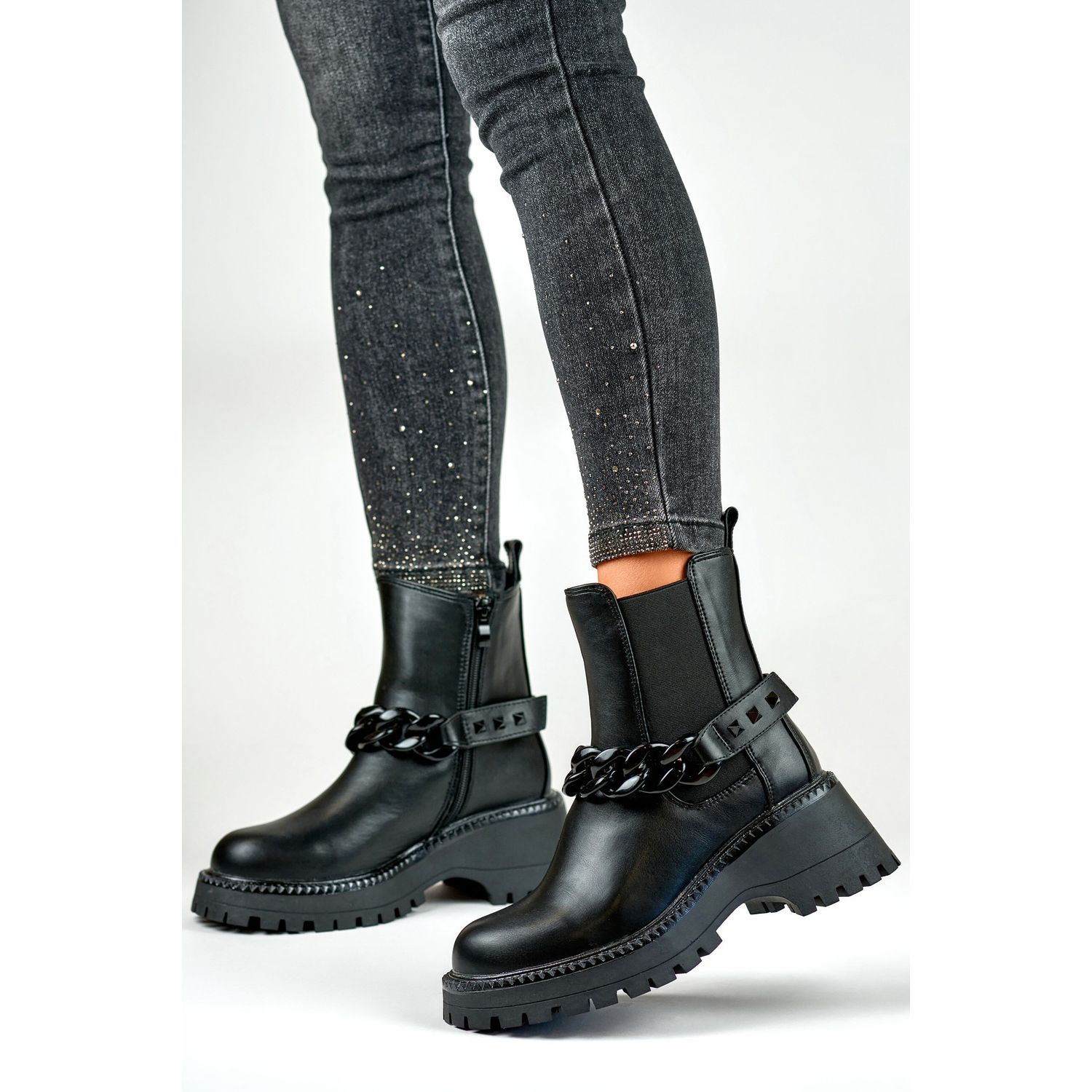 A parte superior de 14 cm de altura fornece suporte ao cubo sólido, que não é apenas estético, mas também prático. Graças a isso, as botas Jodhpur enfatizam o comprimento das pernas, acrescentando elegância excepcional. O interior dos sapatos é coberto com couro ecológico, o que garante o conforto de usar o dia todo. Uma vantagem adicional das botas Jodhpur é o isolamento na forma de um cobertor de calçados, que protegerá seus pés contra o frio em dias mais frios.