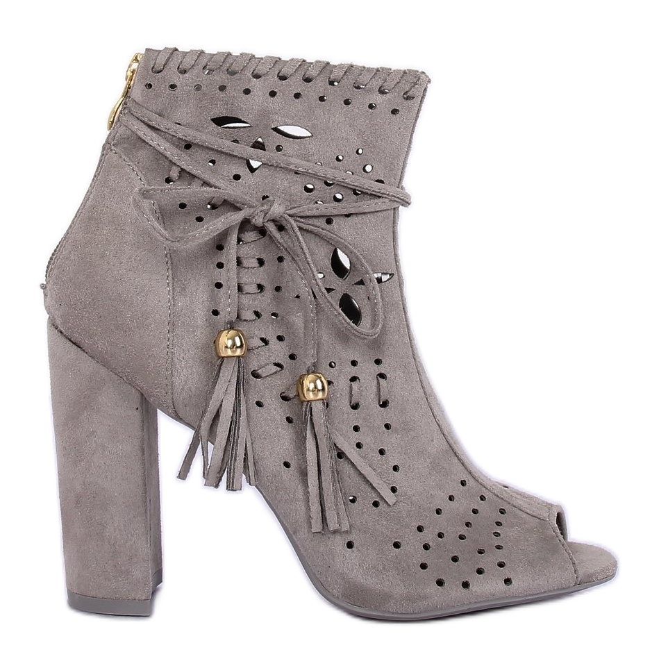 Descubra extraordinários botins abertos num elegante tom de cinzento M285P Grey, que serão um complemento perfeito para o seu guarda-roupa! Estes sapatos femininos fenomenais combinam design moderno e conforto de uso. O corte bem torneado e o salto fino de 11 cm enfatizam as pernas e conferem a cada estilo um caráter feminino.