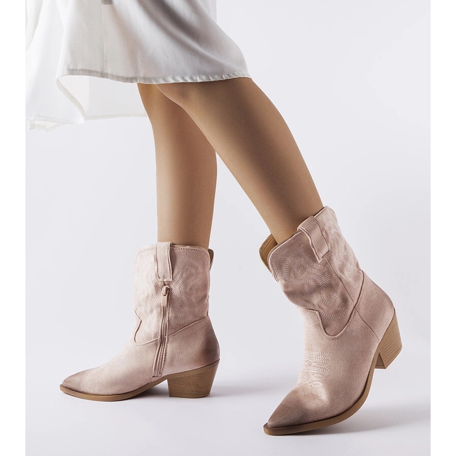 As botas expressivas e universais - Ernestine são botas de cowboy feitas de couro de camurça ecológica de alta qualidade, que complementará perfeitamente estilizações casuais e mais femininas. A parte superior característica e arredondada, um bloco de corte com uma altura de 5 cm e loops de correia que facilitam a colocação da natureza do cowboy dos sapatos, e a cor rosa acrescenta notas da moda.