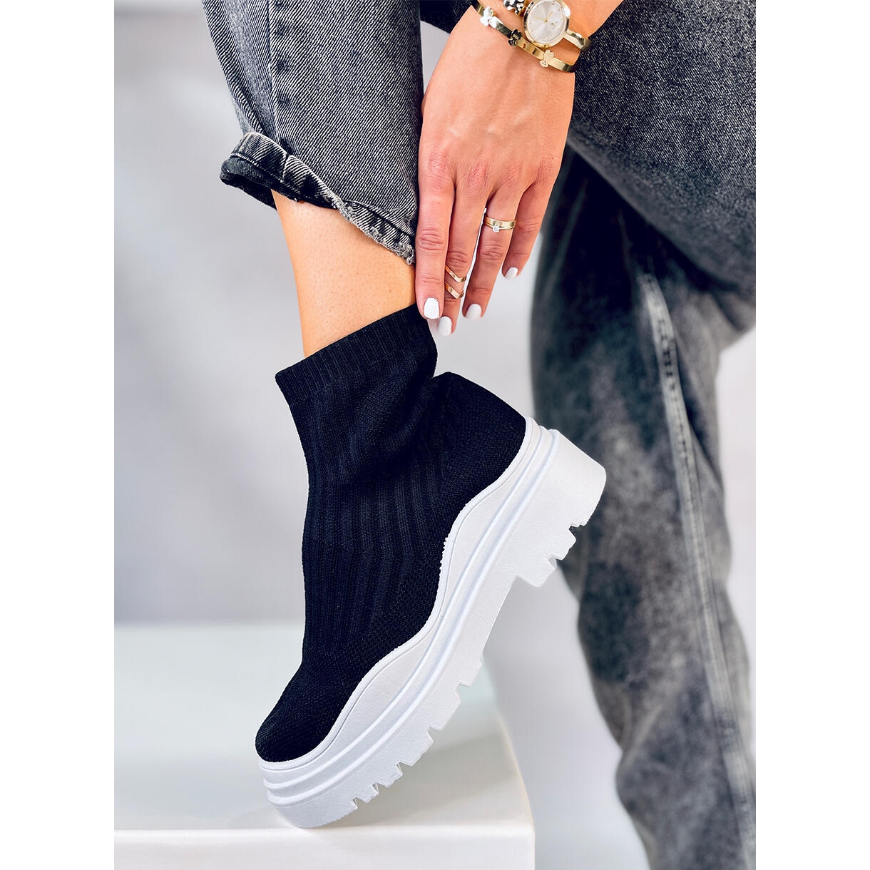 Apresentamos elegantes botas BM com cano preto flexível, que aliam estilo e conforto. Estas botas extremamente modernas, confeccionadas em tecido tipo meia, ajustam-se perfeitamente ao pé, garantindo conforto de uso o dia todo.