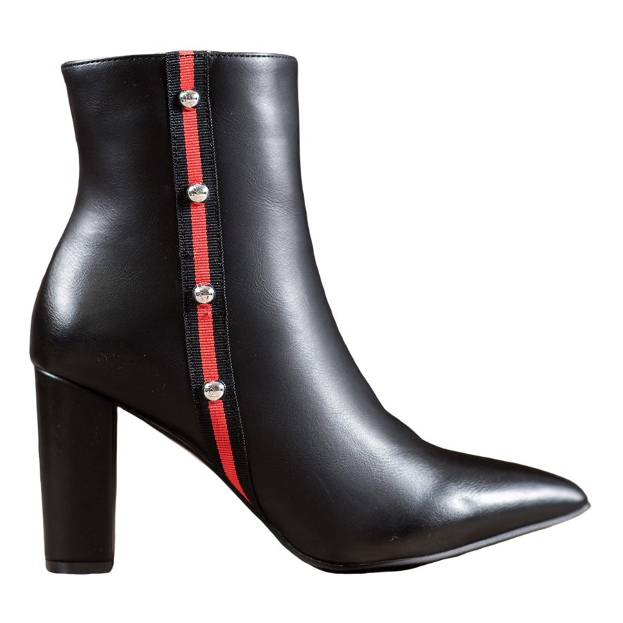 As botas se diferenciam pela biqueira pontiaguda e pelo salto bloco estável de 8,5 centímetros, que garante não só um look fashion, mas também conforto no uso. Confeccionados em couro ecológico de alta qualidade, com strass e faixa decorativa preta e vermelha, conferem personalidade e charme único a cada estilo.