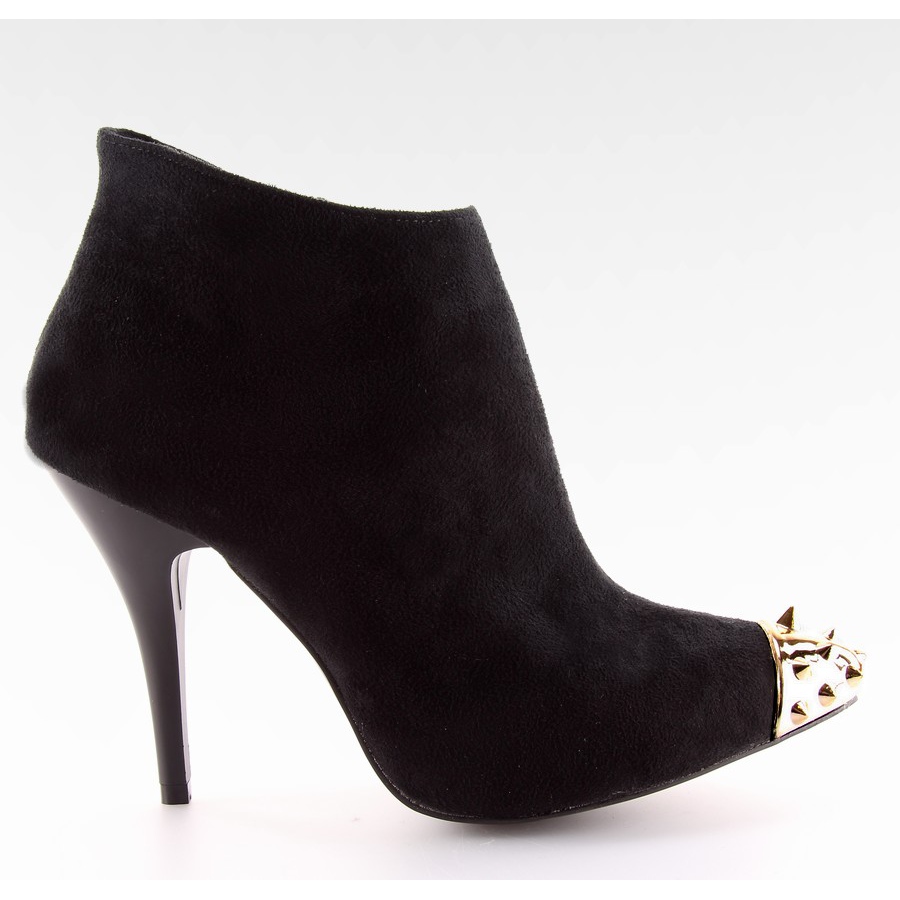 Elegantes botins pretos com salto de 10 cm, confeccionados em couro camurça ecológico. Dedos amendoados dourados e tachas sutis adicionam personalidade a eles. O modelo é forrado com pele delicada, por isso também é indicado para os dias mais frios. Um zíper na parte interna facilita a colocação e a retirada.