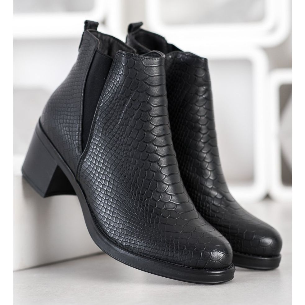 Descubra os modernos e elegantes botins Sweet Shoes na cor preta, que vão complementar perfeitamente o seu guarda-roupa outono-inverno. Estes botins femininos exclusivos distinguem-se por uma parte superior em couro ecológico de alta qualidade, decorada com um padrão em relevo que lembra pele de crocodilo.