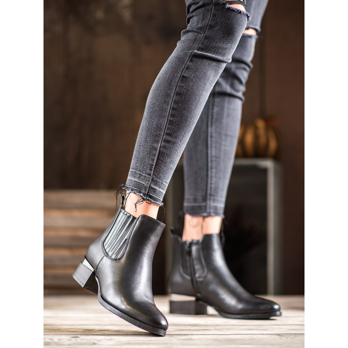 Os botins Super Mode com salto decorativo são a escolha perfeita para todas as mulheres que procuram um calçado elegante e confortável para os dias mais frios. Fabricados em couro ecológico de alta qualidade, combinam perfeitamente a elegância com o conforto do dia a dia. A parte superior preta chega acima do tornozelo, o que os torna um complemento perfeito para vários estilos - do casual ao mais elegante.