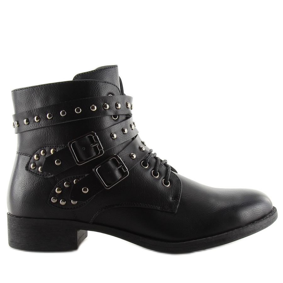 Escolha botins pretos com tachas B0-166 pretos e adicione um pouco de estilo rock ao seu guarda-roupa! Estes sapatos incomuns se tornarão não apenas um elemento moderno, mas também confortável do seu traje.
