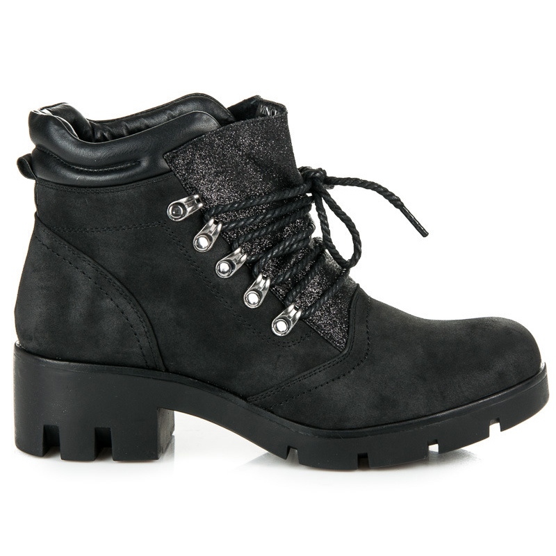 O tênis preto tem salto plano de 5 cm de altura, o que garante conforto e estabilidade a cada passo. Graças ao isolamento, estas botas com atacadores são perfeitas para os dias mais frios e a parte superior alta, acima do tornozelo, protege adicionalmente os pés.