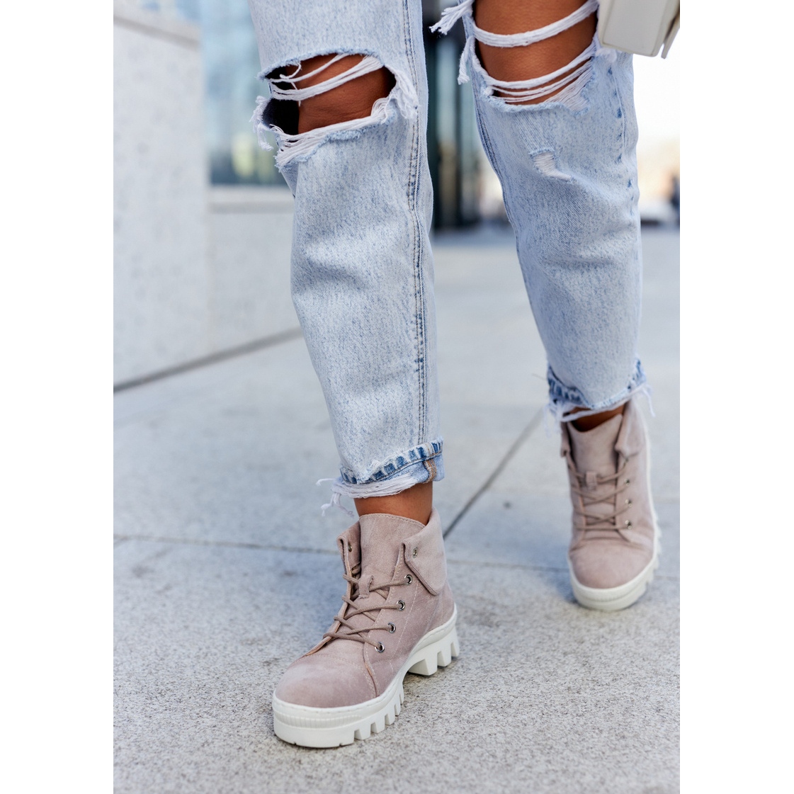 Botas elegantes e confortáveis que adicionarão o personagem a conjuntos casuais. Feito de camurça ecológica em uma sombra moderna e leve. Coloque em uma sola grossa e cortada, com um nariz arredondado e rígido e laço para atacadores redondos. A parte superior chega ao tornozelo e é levemente enrolada, que é enfatizada por sua cidade, caráter informal.