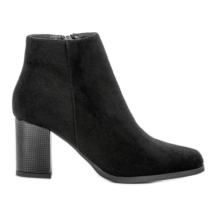 Apresentamos botins pretos de salto alto da marca Filippo, uma escolha perfeita para a temporada outono/inverno. Feitos de couro camurça ecológico, estes sapatos elegantes combinam estilo com conforto. A altura do salto é de 7,5 cm, aumentando a altura e emagrecendo o corpo. O delicado padrão no calcanhar é uma decoração sutil, e o aquecimento do interior mantém os pés aquecidos mesmo nos dias mais frios.
