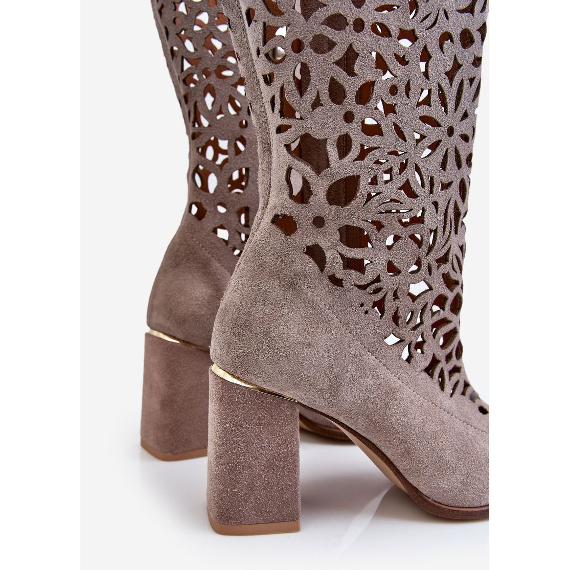 O contraforte reforçado do calcanhar apoia a estabilidade do pé, enquanto a palmilha em couro natural da mais alta qualidade abraça suavemente o pé, o que, combinado com um salto bloco estável de 8,5 cm de altura, garante uma caminhada confortável durante todo o dia. Confeccionadas em camurça macia, essas botas se ajustam perfeitamente à perna, mantendo a permeabilidade ao ar graças ao padrão vazado, que é especialmente importante nos dias mais quentes.