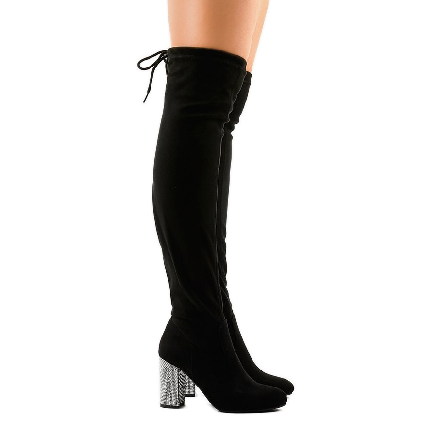 O cano alto, que chega acima do joelho, confere elegância a qualquer estilo e deixa as pernas mais finas. Além disso, strass no calcanhar dão um pouco de brilho, conferindo ao calçado um caráter original.