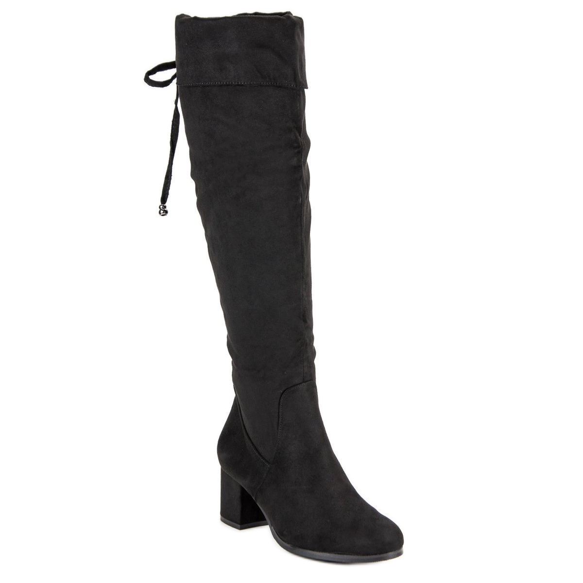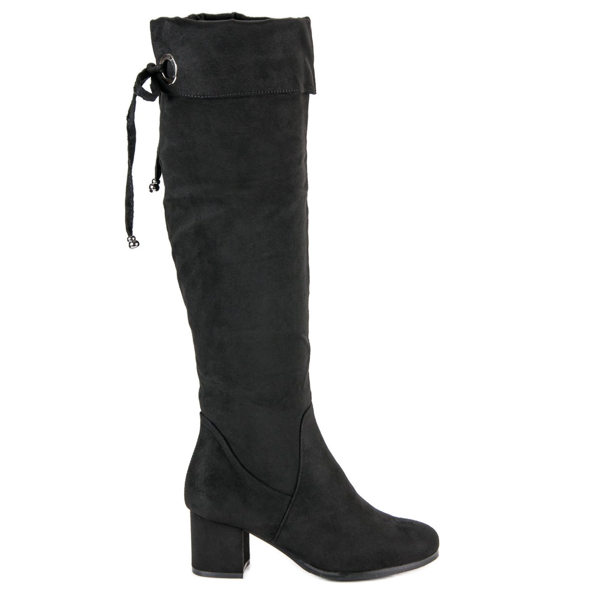 As botas de camurça preta são uma peça atemporal que vai agregar elegância a qualquer look. Confeccionados em camurça ecológica de alta qualidade, esses calçados chamam a atenção pelo seu formato clássico e atenção aos detalhes. Graças à altura superior acima do joelho e ao salto bloco de 6 cm de altura, as botas valorizam perfeitamente as pernas femininas, garantindo estabilidade e conforto de uso.