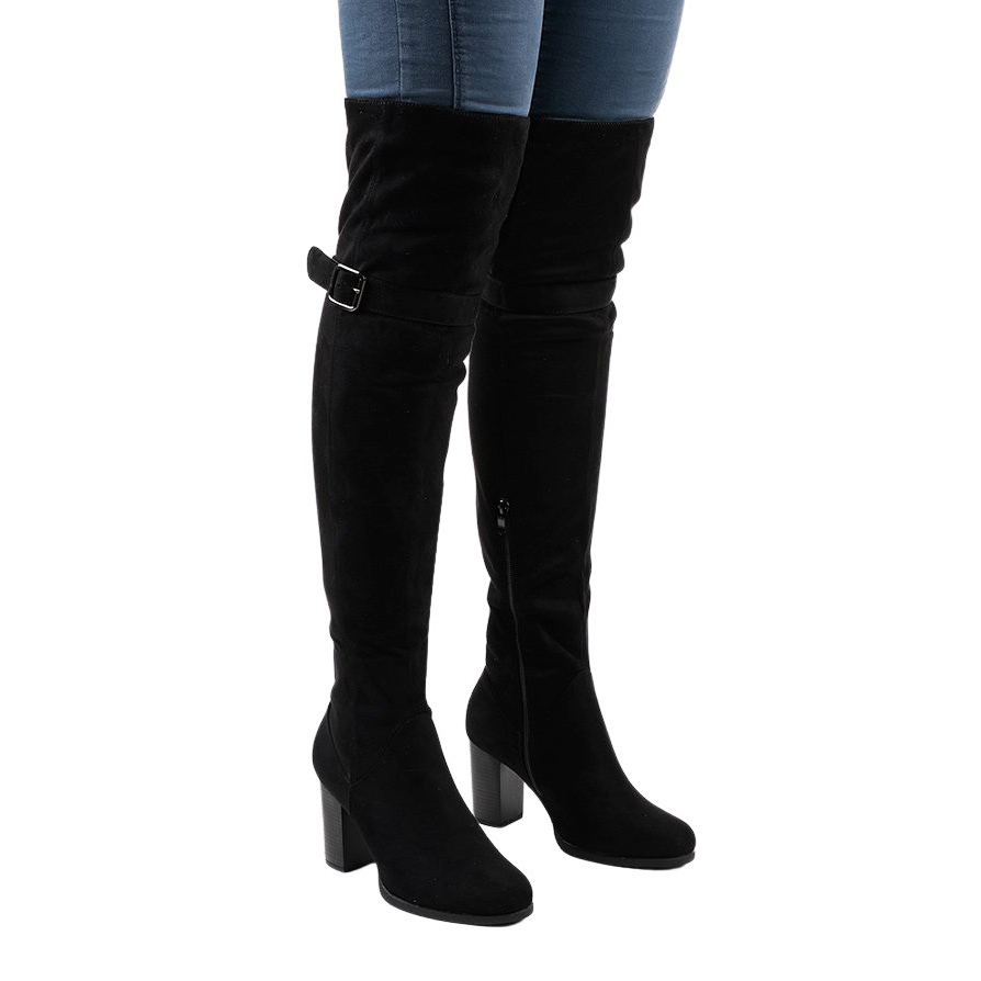 As botas possuem um prático zíper na lateral, o que facilita a colocação e a retirada. A biqueira redonda e o espigão de 5 cm de altura tornam os sapatos confortáveis e estáveis, e a altura dos sapatos de 60 cm faz com que fiquem lindos na perna.