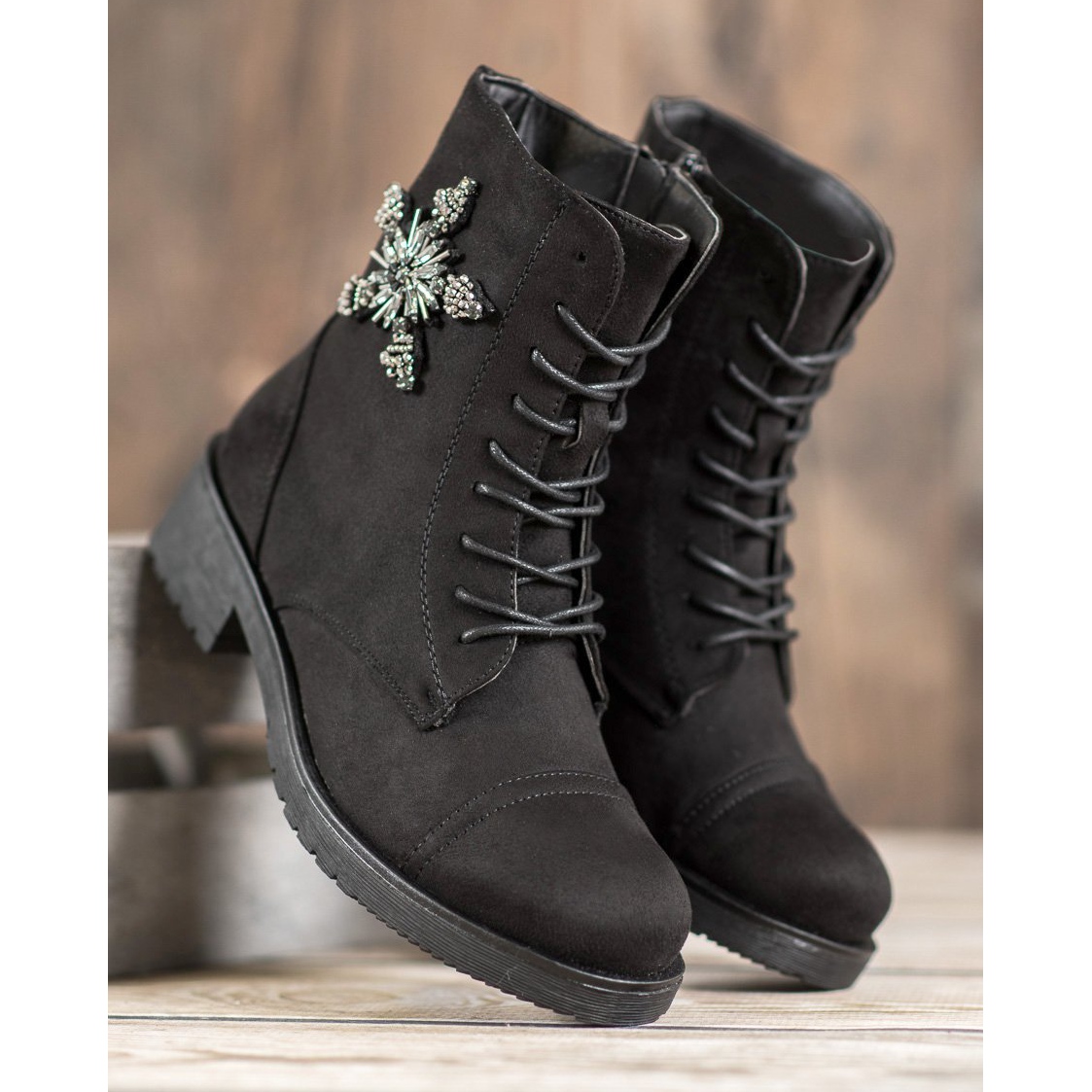 Descubra elegância e estilo únicos com botins SHELOVET de camurça preta. Feitos em camurça ecológica de alta qualidade, estes sapatos femininos da moda são uma ótima opção para os dias de outono. Sua construção rendada e decorações originais de lantejoulas chamam a atenção, acrescentando um caráter único a cada estilo.