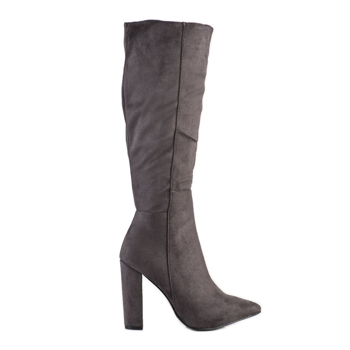 Feitos de couro camurça ecológico de alta qualidade, eles têm um visual extremamente estiloso e seu bico pontudo acrescenta elegância. A altura da bota até o joelho e o salto elevado em forma de poste (10,5 cm) garantem não só um visual atraente, mas também conforto de uso. O aquecimento do interior torna-os na escolha ideal para os dias mais frios, perfeitos tanto para festas como para comemorações.