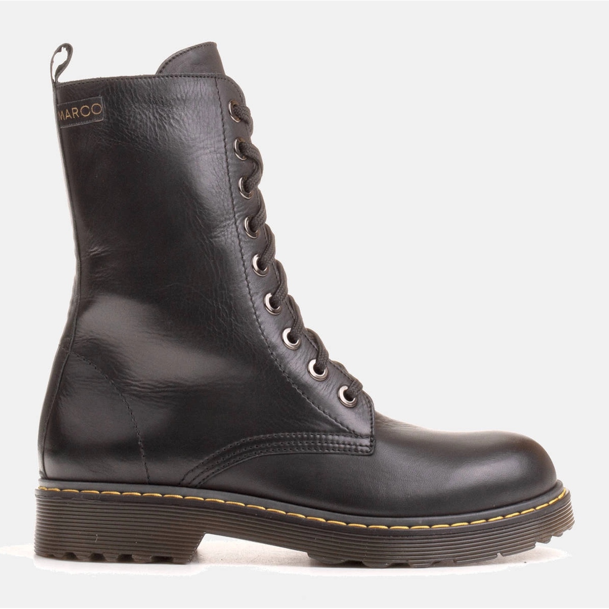 Botas de sapatos Marco elegantes e isolados projetados para mulheres que valorizam uma combinação de um personagem clássico de rock com conforto todos os dias. Couro natural de grãos pretos, um prendedor prático de zíper e laço e uma sola semi -transparente formam um modelo universal e elegante para meses mais frios.