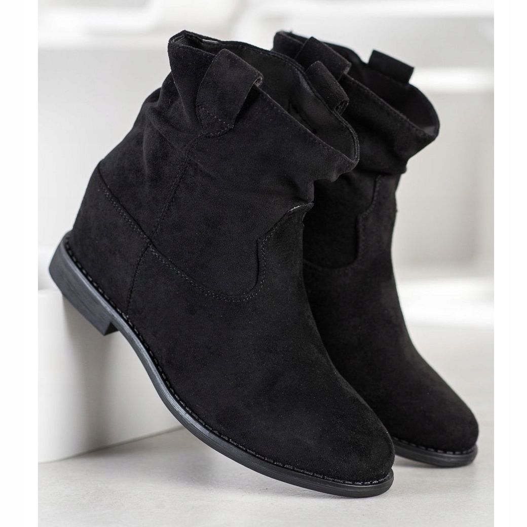 O calçado tem bico redondo e salto reforçado embutido, o que garante estabilidade e sustentação ao pé. Uma parte superior alta que chega ao tornozelo, com 14-15 cm de altura, confere elegância, e uma cunha oculta, com 7 cm de altura, alonga opticamente as pernas e enfatiza a figura. A sola lisa confeccionada em material sintético garante durabilidade e tração em diversas condições.