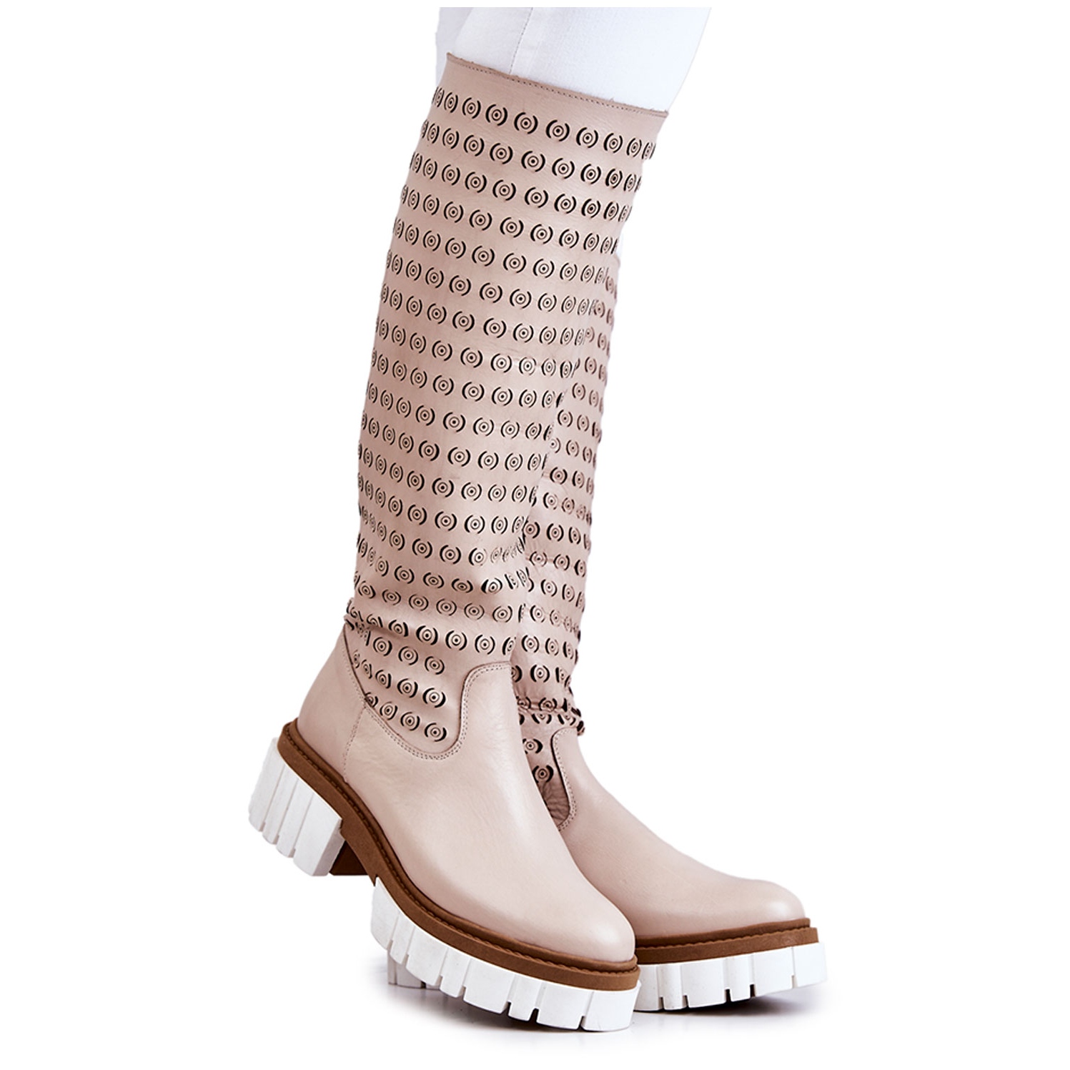 Botas femininas elegantes feitas de couro natural - perfeito para a primavera e o verão. O padrão de trabalho aberto ao longo de todo o comprimento da parte superior fornece leveza e fornece boa ventilação, mantendo um corte clássico e elegante. O zíper do lado facilita a colocação, e a inserção também é feita de couro natural para maior conforto de uso.