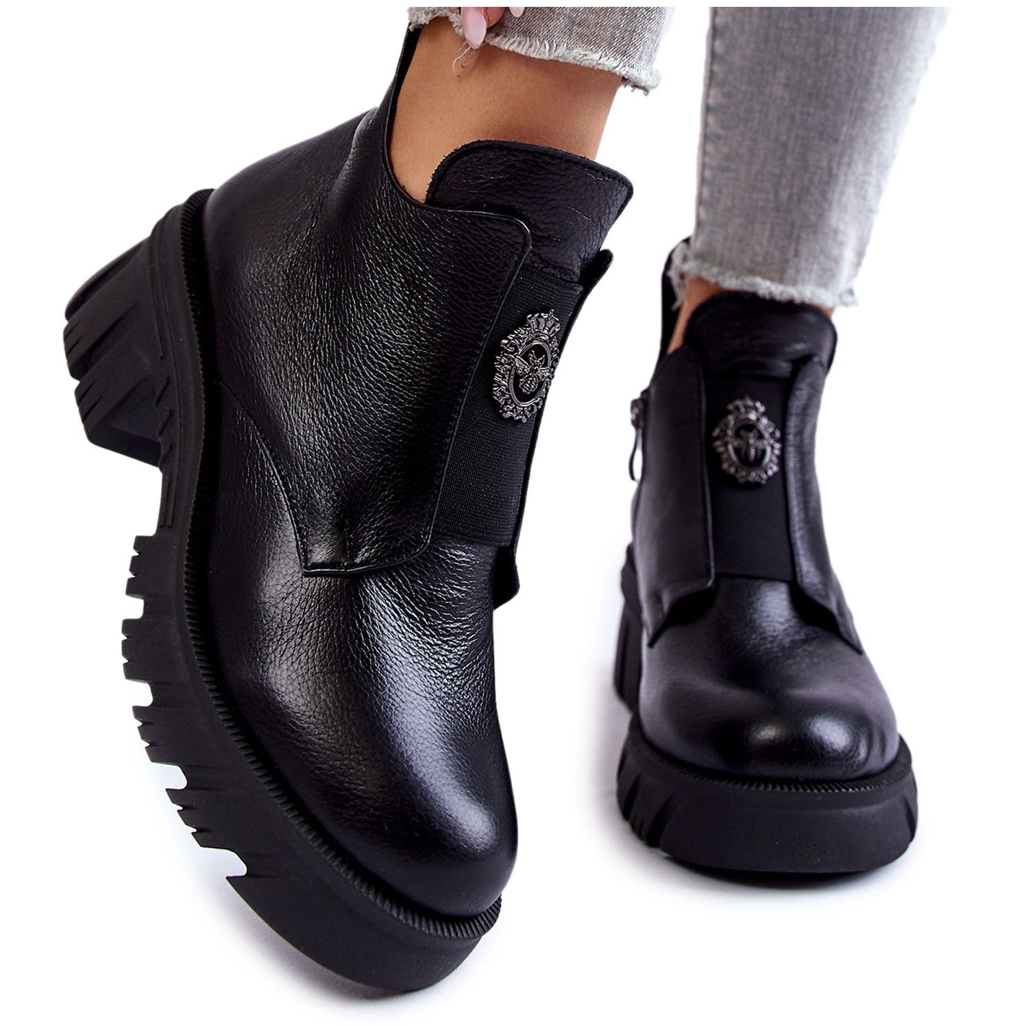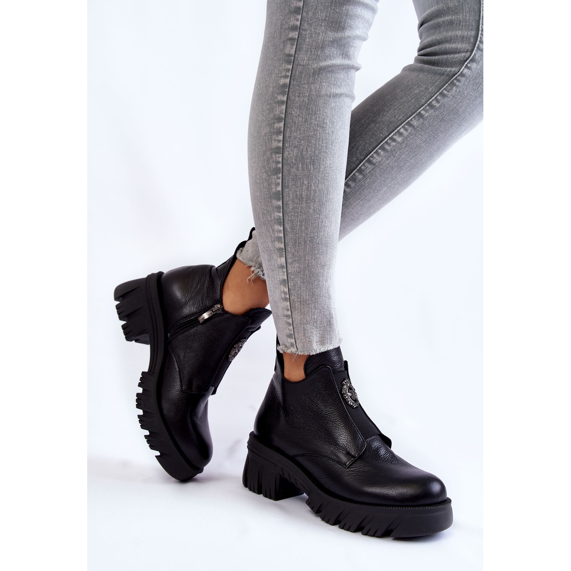 Estas botas exclusivas são decoradas com uma decoração sutil na frente e salto reforçado, o que confere personalidade e garante conforto de uso. Graças ao salto maciço e à plataforma com ranhuras, oferecem estabilidade e conforto ao caminhar. Este modelo fecha com zíper, o que facilita a colocação e a retirada.