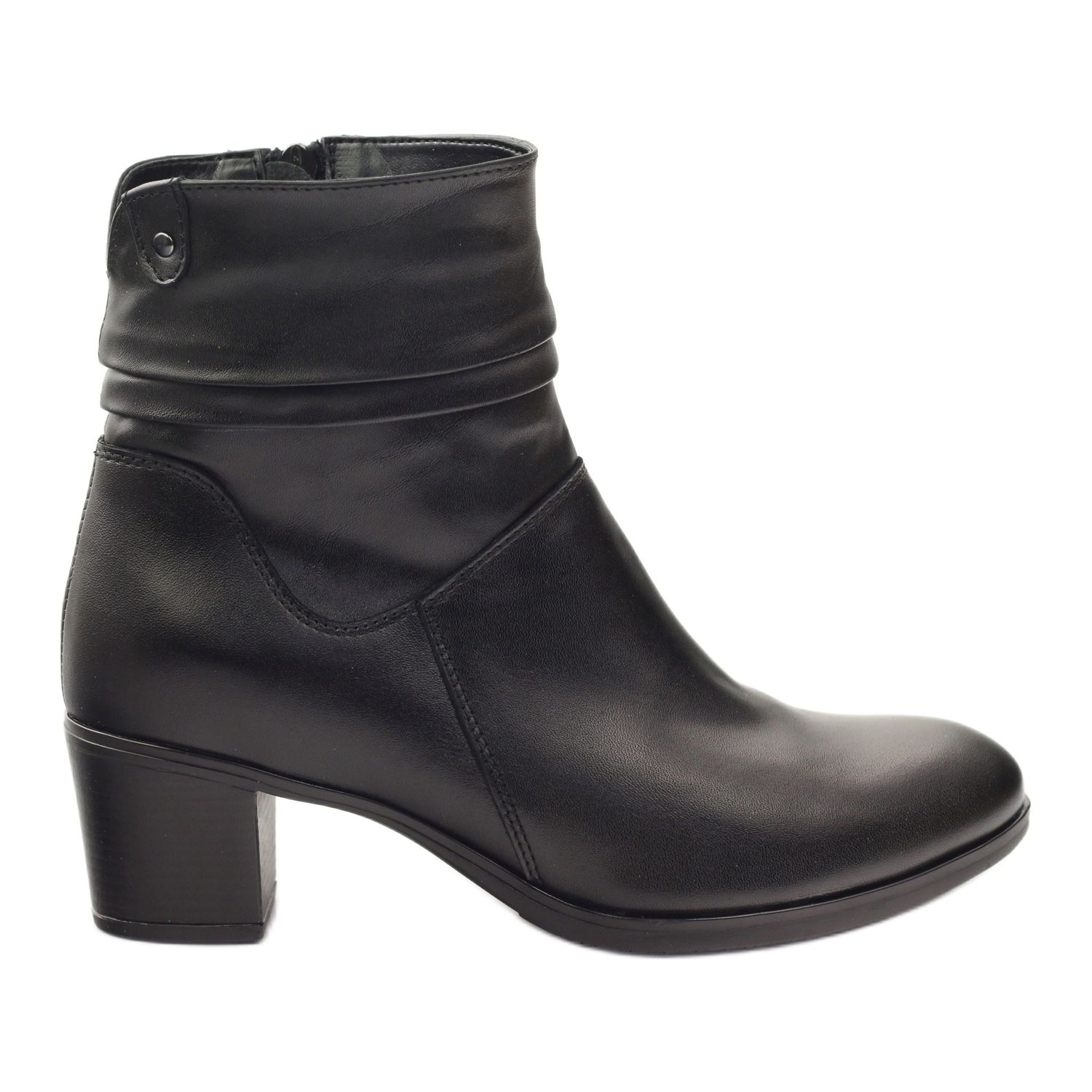 Botas elegantes em couro liso natural na cor preta atemporal. A ponta suavemente arredondada e o corte simples conferem-lhes um caráter universal, e os babados sutis e simétricos nas laterais da parte superior acrescentam um toque feminino. O zíper lateral facilita a colocação rápida e o salto bloco estável de 5,5 cm proporciona um acabamento elegante sem perder o conforto.