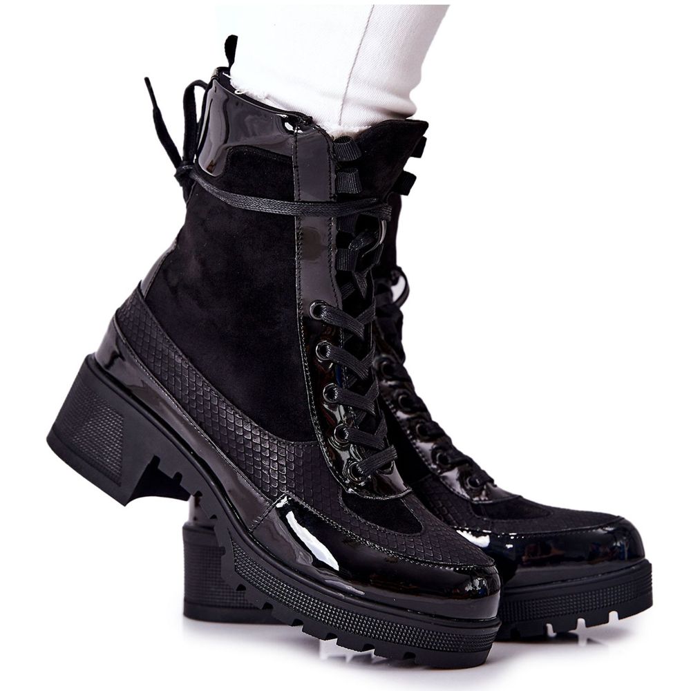 Estas botas da moda são cuidadosamente confeccionadas em couro ecológico de alta qualidade, o que garante durabilidade e facilidade de manutenção. A pele ecológica lacada na parte superior da gáspea e na sola confere-lhes um carácter único e a encadernação permite um ajuste perfeito a qualquer pé. Um delicado salto bloco (altura 4,5 cm) levanta sutilmente a figura, tornando o estilo do dia a dia mais elegante.