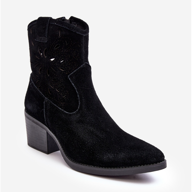 Botas de cowboy femininas elegantes feitas de couro natural de camurça, decoradas com um padrão de trabalho aberto em toda a parte superior. O modelo combina uma aparência feminina com um salto confortável e estável como um post (altura de 6 cm). Preso com um controle deslizante do lado, com um dedo de pé claramente alongado e apontado que diminui opticamente a perna. Perfeito para a primavera, verão e outono - sem isolamento.