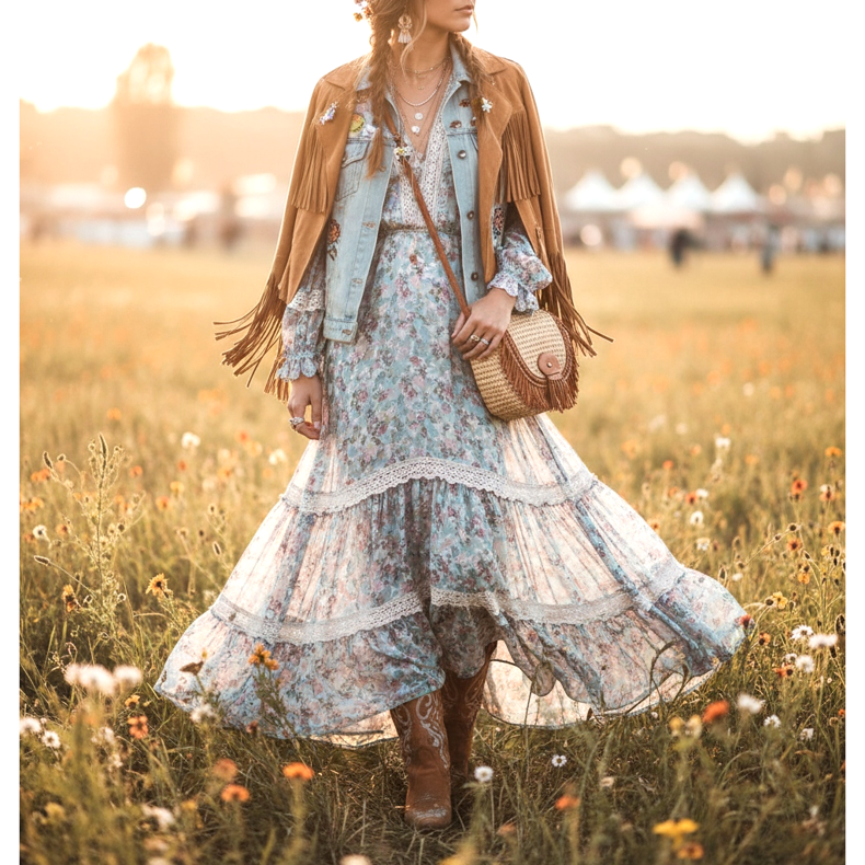 O melhor companheiro para botas de cowboy é um vestido arejado estilo boho. Escolha um modelo com flores, babados ou renda. O contraste entre o pesado sapato de couro e o delicado material do vestido cria um efeito extremamente estiloso. Adicione uma jaqueta de camurça com franjas ou uma katana jeans e você estará pronto para um festival ou um encontro.