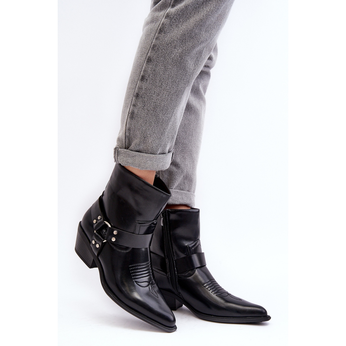 Botas de cowboy elegantes que combinam aparência elegante com conforto todos os dias. Feito de couro ecológico, colocado em um calcanhar baixo, 5 cm - perfeito se você estiver procurando sapatos de tornozelo que opticamente mancham a figura graças ao dedo do pé pontilhado. A parte superior (15 cm de altura) decorada com costura, faixas e detalhes conectados, como strass e bordados, fornece o caráter de qualquer estilização. O agente isolado com um cobertor de calçados macios - perfeito para dias mais frios. O fixador ZIP facilita a inserção e a sola de plástico garante permanentemente a estabilidade.
