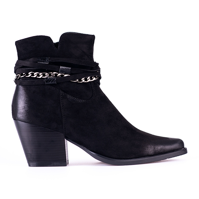 Sinta-se à vontade para usar estes botins tanto para ocasiões do dia a dia como para momentos especiais. A elegante cor preta e a corrente decorativa, que é um elemento de design original, garantem uma aparência bonita. A altura do salto é confortável de 7 cm - uma solução perfeita para combinar estética com conforto.