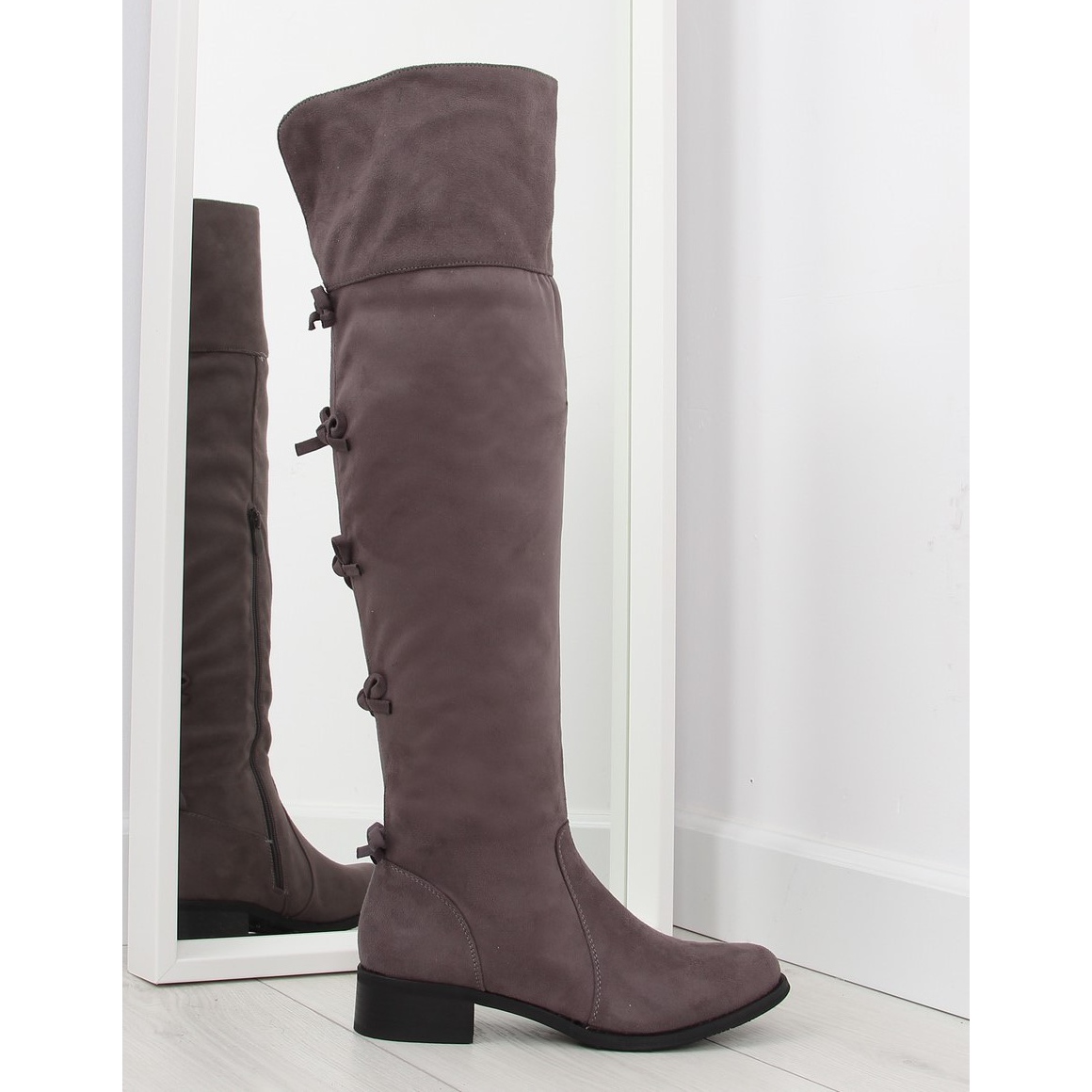 Botas clássicas acima do joelho com cano alto chegando acima do joelho, que combinam um corte atemporal com um toque sutil e feminino. Há laços decorativos nas costas que quebram o visual tradicional e dão leveza ao calçado. O interior forrado com pele delicada proporciona calor e conforto nos dias mais frios, e o zíper interno facilita a colocação rápida.