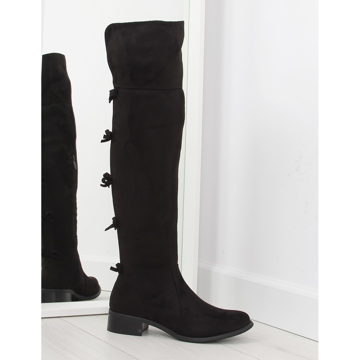 Mosqueteiros clássicos com um sotaque sutil e feminino. O cabedal alto, chegando acima do joelho, valoriza a perna, e os laços nas costas quebram o corte tradicional, agregando elegância e leveza. O interior é forrado com pele delicada para aquecer e o zíper interno facilita a colocação rápida. Feito em camurça ecológica - um look estiloso sem sacrifícios.