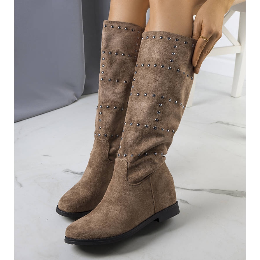 O cano alto e uma cunha oculta de 5,5 cm alongam sutilmente as pernas e, graças ao material confeccionado em couro camurça ecológico de alta qualidade, você pode desfrutar não só de um visual único, mas também de alto conforto de uso. O interior do calçado é cuidadosamente acabado com um material que imita pele, que proporciona calor e conforto adicionais mesmo nos dias mais frios.