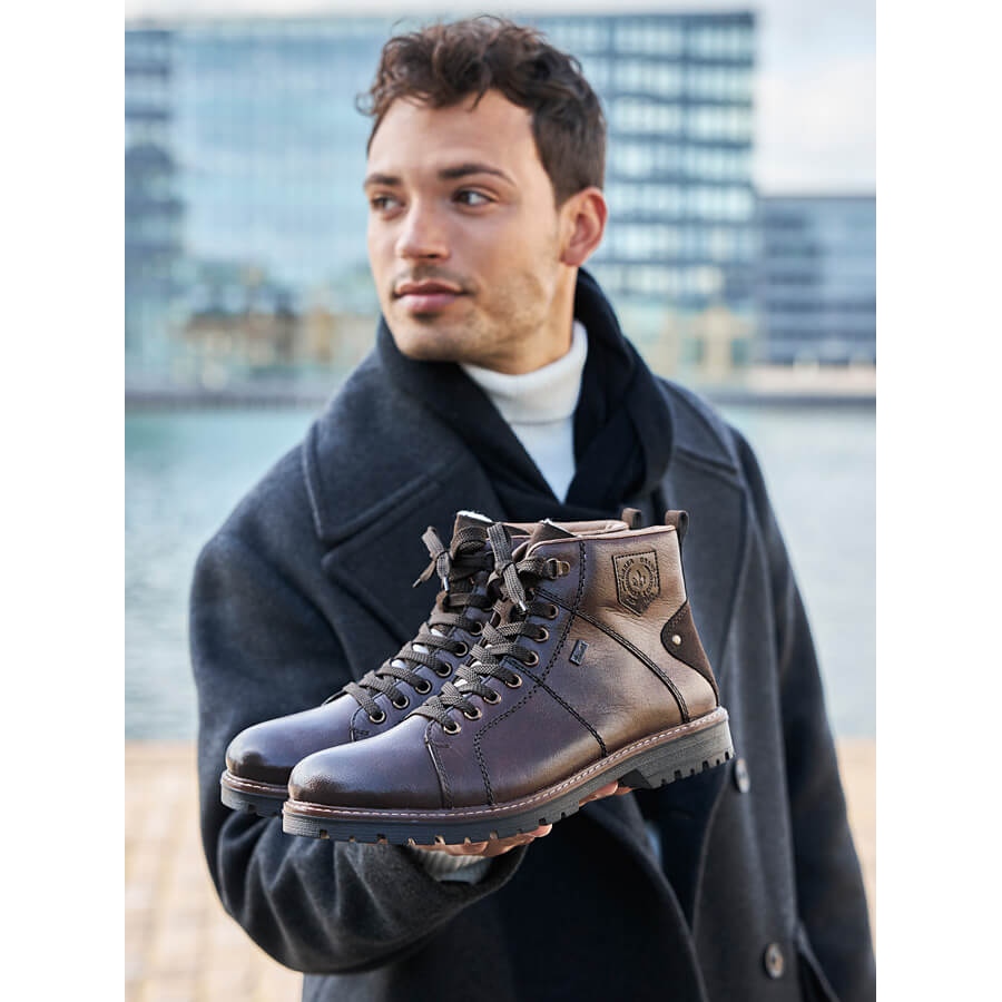 Detalhes: Botas de inverno impermeáveis para homens isoladas com lã de ovelha Rieker F3602-25 marrom
