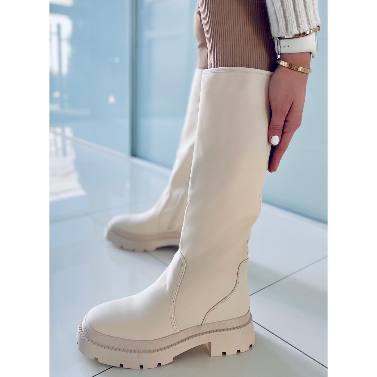 A altura das botas até ao joelho e o isolamento interno fazem delas uma óptima solução nos dias mais frios. Além disso, sua cor bege universal pode ser facilmente combinada com uma variedade de peças de roupa, desde jeans até vestidos elegantes.