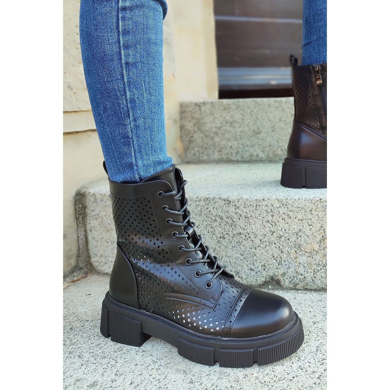 Botas elegantes e abertas da coleção Keeshoes são uma proposta para mulheres que valorizam o estilo e a funcionalidade. Feito de couro ecológico de alta qualidade (externo e inserção), em preto atemporal, eles são ótimos como um complemento às estilizações cotidianas e mais elegantes. O acabamento OpenWork acrescenta leveza e melhora a ventilação, e é por isso que os sapatos são universais na primavera/verão e nos dias mais quentes do outono. A falta de aquecimento significa que eles não são destinados a dias frios de inverno sem meias isolantes adicionais.