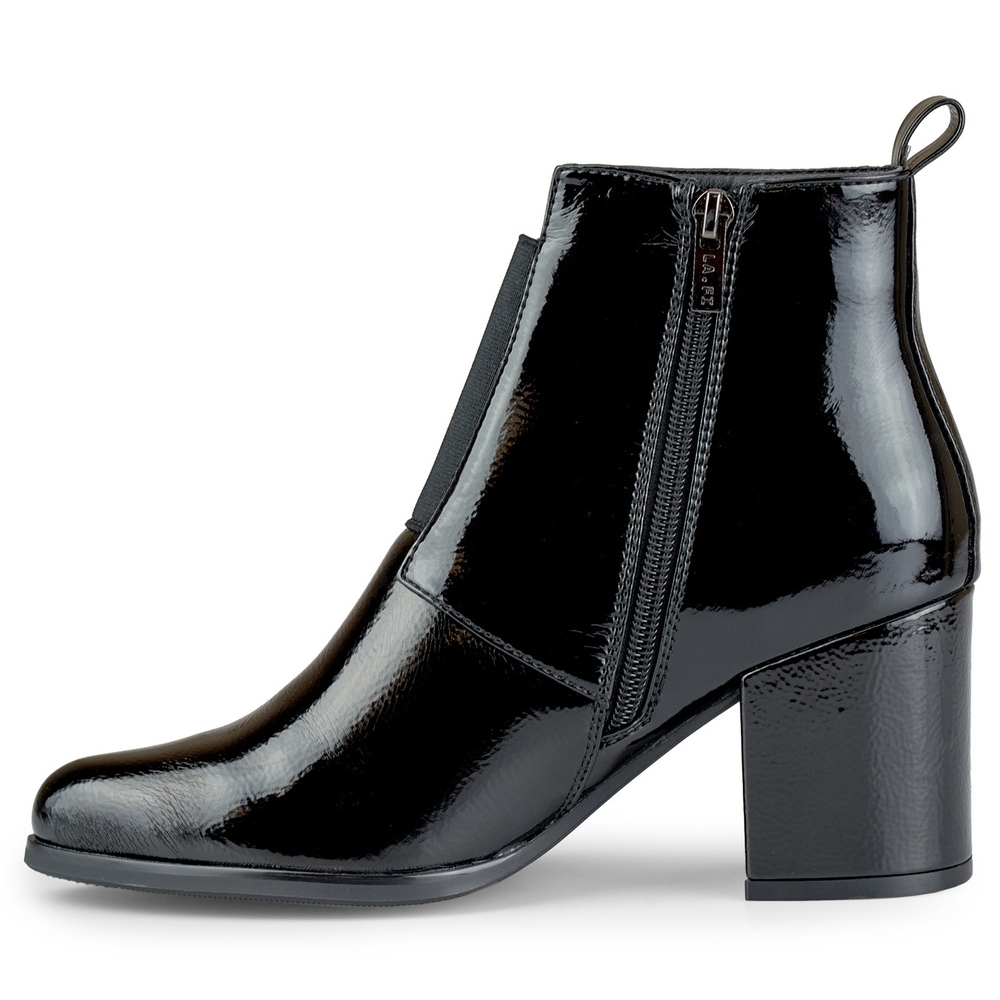 Oferecemos-lhe botins femininos pretos estilosos e elegantes com acabamento envernizado, garantindo conforto e um look fashion no outono e inverno. Estes botins flexíveis são a quintessência de um clássico do dia a dia com um toque de moda, que será um complemento perfeito para qualquer estilo urbano. O carácter único do calçado é realçado pela parte superior em camurça ecológica brilhante, que contrasta lindamente com o clima outono-inverno.