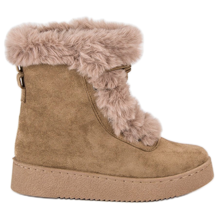 Além disso, as botas de neve marrons com cadarço caracterizam-se por uma plataforma baixa com 4,0 cm de altura e sola sólida com banda de rodagem, o que garante excelente aderência em superfícies escorregadias. O padrão de pele de carneiro na parte superior adiciona um charme único aos sapatos e os torna um complemento perfeito para muitos estilos de inverno.