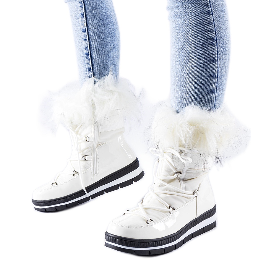 Detalhes: Botas de neve brancas envernizadas com pele de arco branco