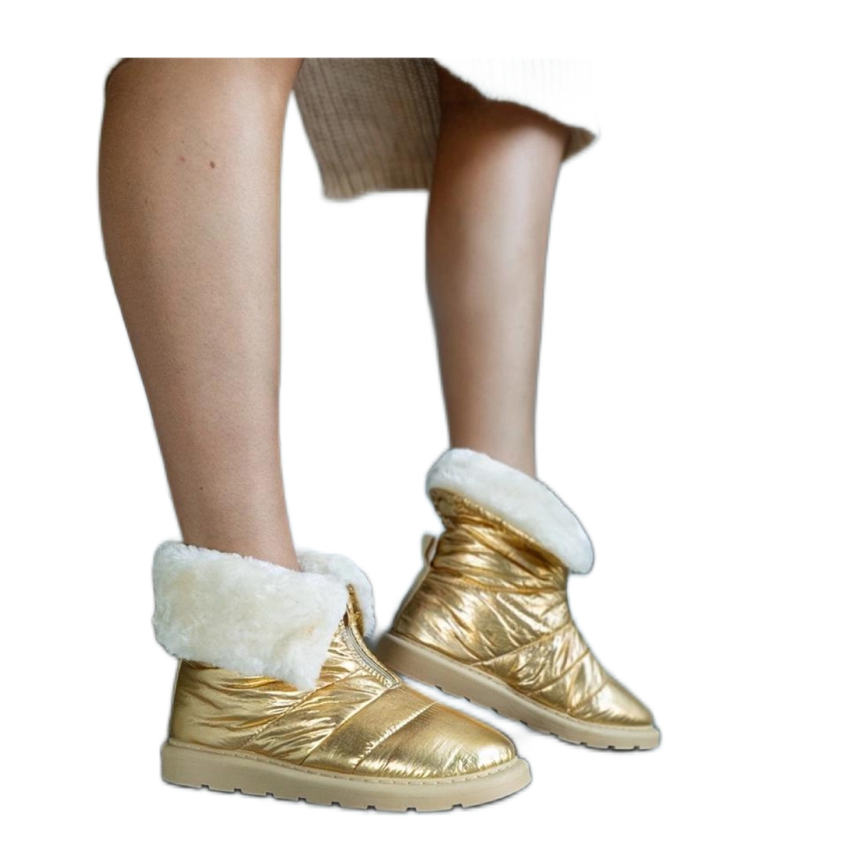 Botas de neve isoladas douradas com uma gola são calçados perfeitos para dias de inverno, que combinam não apenas a funcionalidade, mas também as últimas tendências da moda. Feito de tecido de alta qualidade, eles garantem durabilidade e conforto do uso e, graças à costura sólida e um dedo redondo, eles ficam ótimos no pé.