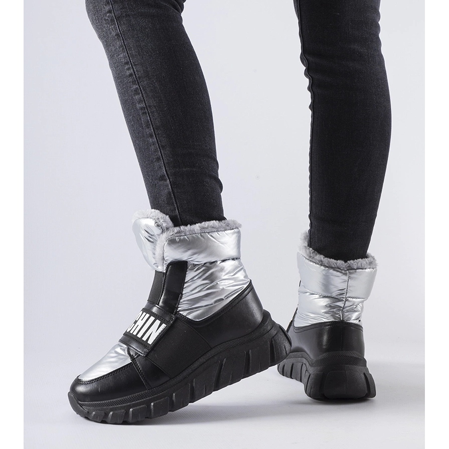 Seu design moderno, enriquecido com uma plataforma elegante e um nariz redondo, dá a eles uma aparência elegante que certamente atrairá a atenção. O corte deslizante torna mais fácil vestir rapidamente e remover sapatos, o que é inestimável em condições climáticas difíceis. O interior terminado com peles acrescenta aconchego, e a cor prateada enfatiza o estilo e a individualidade de cada mulher.