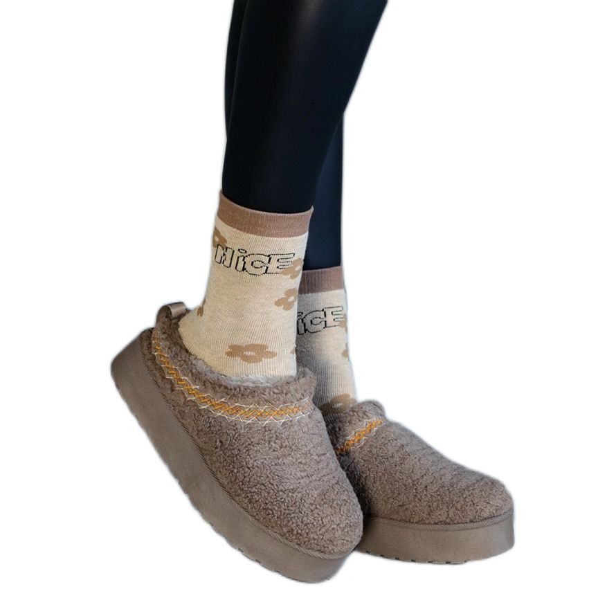 Descubra as botas de neve em uma plataforma com um padrão superior baixo e um padrão bordado em cores bege - calçados perfeitos para dias de inverno que combinam estilo, conforto e funcionalidade. Graças ao dedo redondo e à parte superior baixa, esses chinelos são extremamente práticos, e o corte inserido garante a facilidade de colocar e remover.