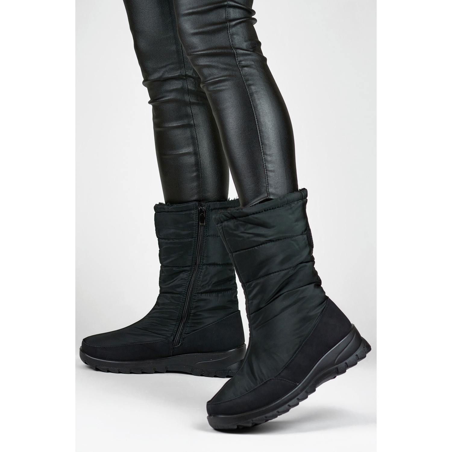 Botas de neve femininas altas e confortáveis - pretas, com pêlo e trava lateral