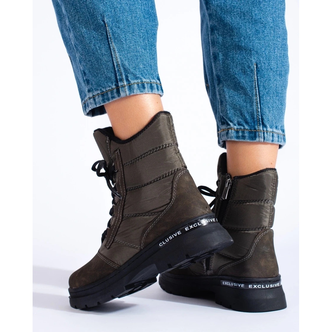 Botas de neve femininas elegantes e confortáveis são atadas em uma cor verde da moda - perfeita para dias mais frios. A combinação de camurça ecológica e elementos ecológicos da pele garante uma aparência elegante com uma abordagem ecológica dos materiais. O aquecimento e uma palmilha têxtil garantem conforto térmico, e uma sola sintética sólida com piso oferece boa adesão às superfícies nevadas e úmidas.