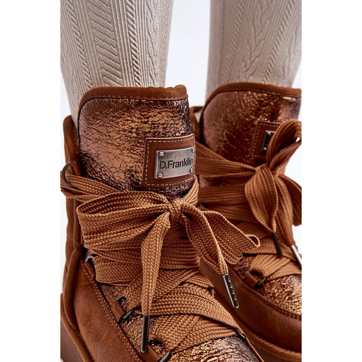 O modelo DFSH370006 da D.Franklin distingue-se também pelos atacadores grossos, que não são apenas um elemento decorativo, mas também garantem um ajuste perfeito ao pé. Estas propriedades tornam estas botas de neve elegantes e funcionais, perfeitas para passeios de inverno pela cidade ou para uma viagem fora da cidade.